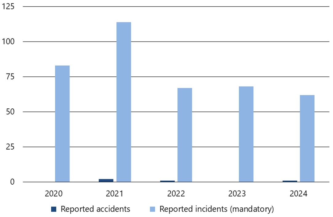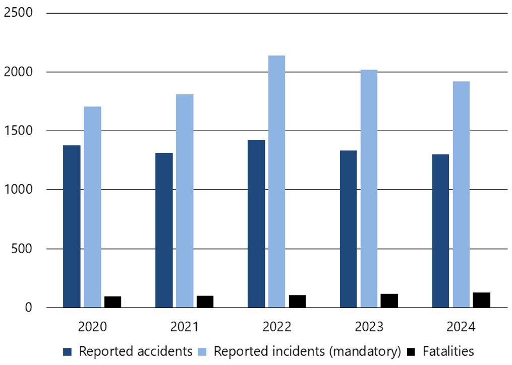 Of the 3222 reported occurrences, 1303 were accidents, which is 3% below the 2023 total of 1342, and 14% below the 10‑year average of 1507; and 1919 were incidents, which is a 5% decrease from the 2023 total of 2014, and 5% less than the 10-year average of 2014.