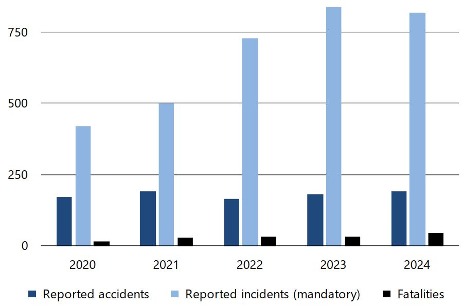 | Occurrences reported to the TSB | 2020 | 2021 | 2022 | 2023 | 2024 |
