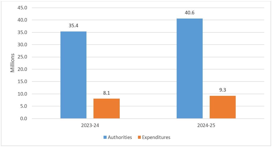 The TSB’s total authorities available for use increased by 5.2M dollars between fiscal years 2023-24 and 2024-25. This significant increase is mainly due to newly acquired funding obtained through Budget 2023, which provided funding for critical TSB operations, most notably the hiring of new investigators as well as funds for crucial IT investments. The TSB also received funding for employee salary increases resulting from newly signed and ratified collective bargaining agreements. These increases are slightly offset by government-wide savings as part of the Government of Canada’s Refocusing Government Spending initiative.