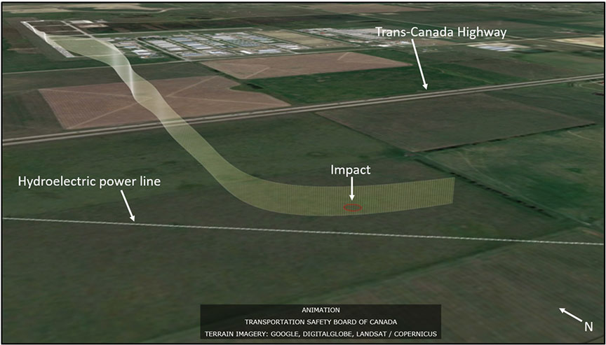 The aircraft then entered a tight descending and rolling left turn approximately 300 feet north of hydroelectric power lines that were running in an east–west direction. The estimated airspeed dropped to about 65 KCAS when the aircraft was at an altitude of about 100 feet AGL (Figure 1 and Figure 2).