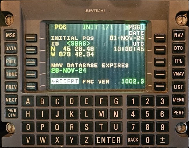 Like all Air Creebec Dash-8s, the occurrence aircraft had 2 UNS-1Lw FMSs manufactured by Universal Avionics, with version 1002.3 of the pilot software. These FMSs operate in synchronized mode, allowing each pilot to check and amend the flight plan as needed. They have a flat control and display panel (Figure 5) where the flight plan waypoints, among other things, are displayed. This panel is also used to program modifications to the FMS flight plan.