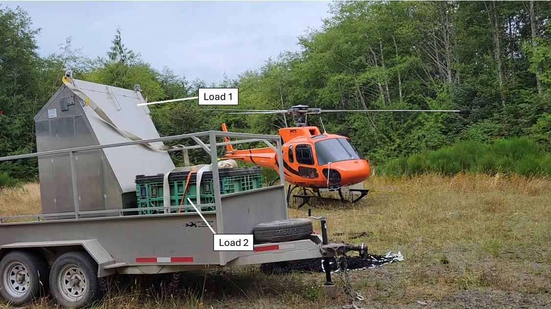 The pilot took the heavier load first.The 1st load was a geological sensing equipment enclosure called a hut or kiosk. The exterior was unpainted metal, and the dimensions were approximately 60 inches × 50 inches and 80 inches tall. The load was connected to the longline assembly consisting of a 75-foot synthetic cable with an additional 20 feet of lanyard.A lanyard is a shorter line or cable that connects the load to the longline. It is used to stabilize and secure the load during transport. While the longline provides the primary lift and mobility, the lanyard helps control the load’s positioning. The longline assembly’s release mechanism, which allows for detachment of the load, is typically integrated into the longline, not the lanyard. In addition to the load, a 40-pound net was attached to the load to improve flight stability. At 0931, the helicopter lifted off with the external load attached. Shortly after liftoff, the pilot reported by radio that the load was within weight limitations and stable. The helicopter was observed flying normally until it flew beyond the customer technicians’ line of sight. The helicopter was expected to return within 30 minutes for the 2nd load.