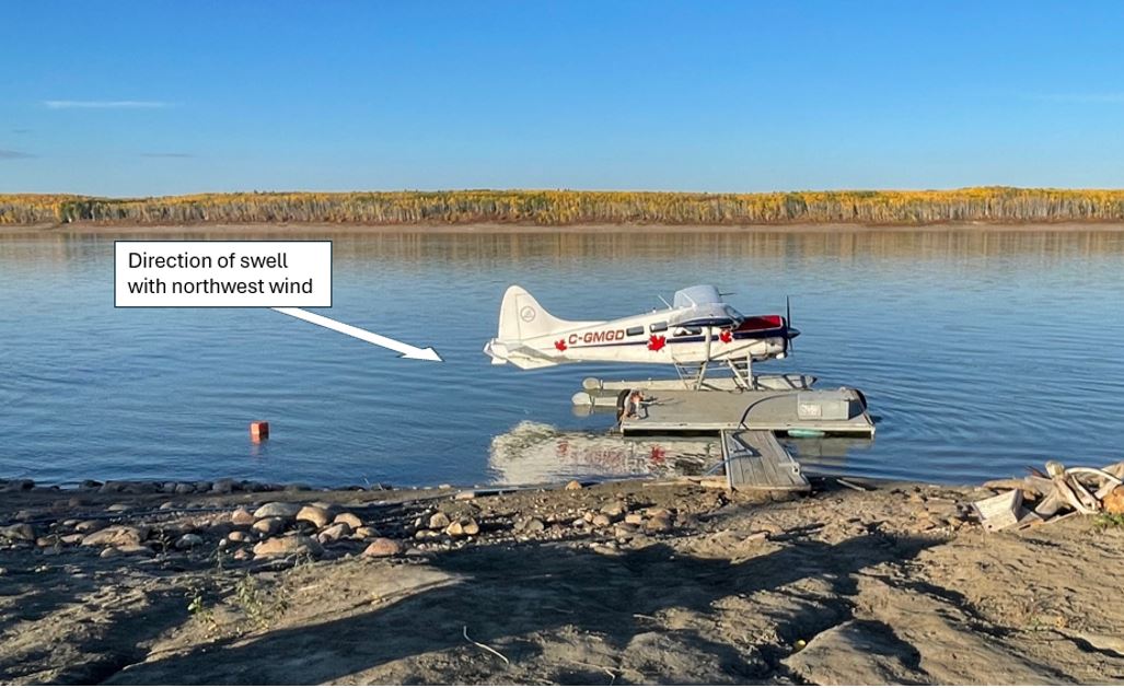 On the day of the occurrence, the Mackenzie River water level at the CEZ7 dock was low and the winds were from the northwest above 10 knots. This created a swell that was hitting the aircraft from the left rear at approximately 45° (Figure 2) to the aircraft’s longitudinal axis. This condition can give the appearance of the fuel tank being full at the filler neck. During fuelling, the swell was sufficient to cause fuel to be sloshed and splashed onto the pilot’s clothes. The pilot normally checks the fuel gauges before taking off but could not recall if that was completed for the occurrence flight.