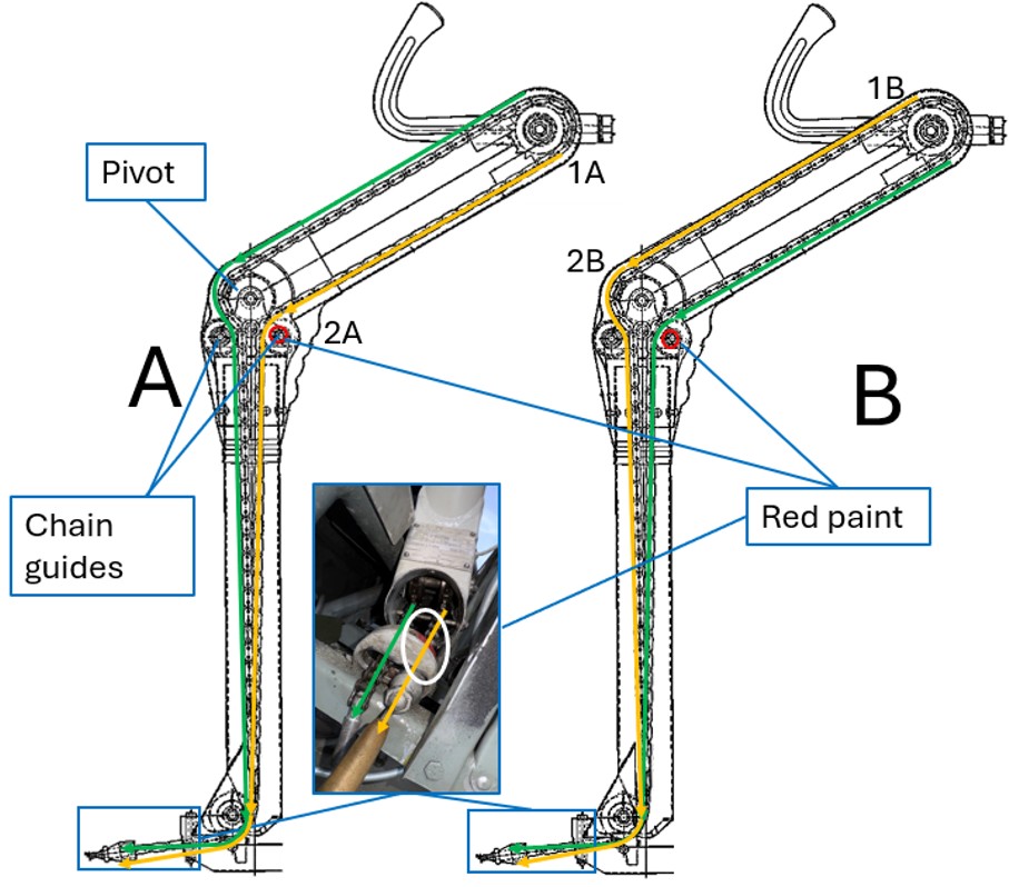 However, when the chain was threaded, the aircraft maintenance manual was not consulted. The apprentice was therefore unaware of the warning about the use of the red paint to thread the chain, and he unknowingly threaded the chain in the opposite direction (Figure 1, point 1B to point 2B).