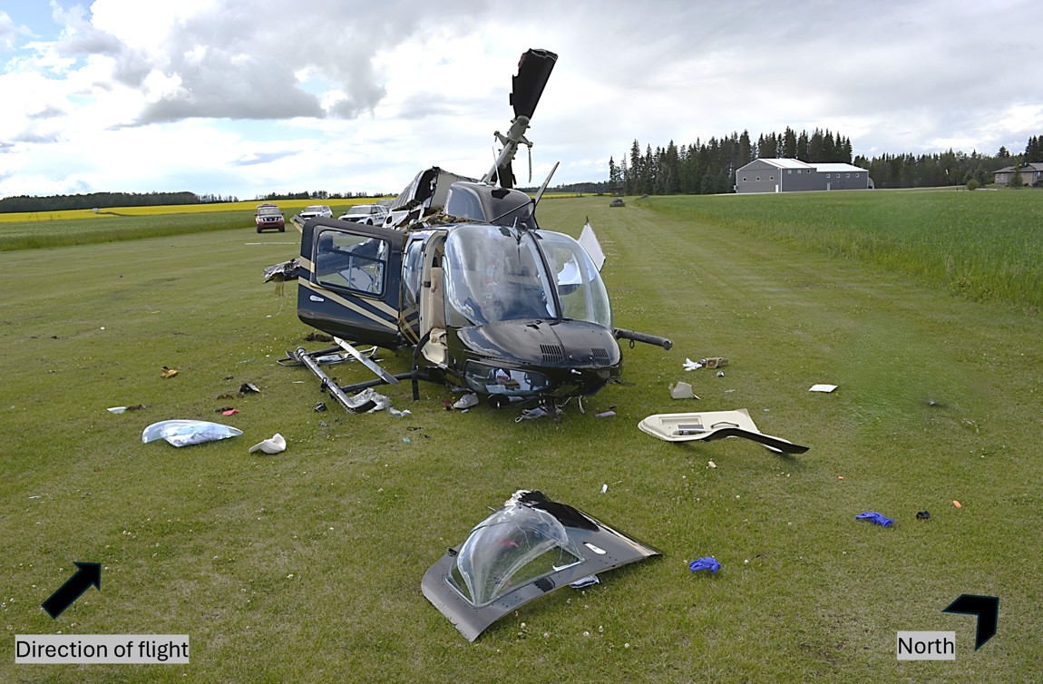 On 06 July 2025, the commercially registered Bell Helicopter Textron Canada Limited (Bell) 206L-4 helicopter (registration C-GKVX, serial number 52387) was conducting a private visual flight rules (VFR) flight from The Lodge at Panther River, Alberta, to the Hespero/Safron Residence Heliport (CTS6), Alberta, with the pilot and 1 passenger on board. At 1213,All times are Mountain Daylight Time (Coordinated Universal Time minus 6 hours) after a 34-minute flight, the helicopter overflew the destination, heading north. The pilot conducted a 360° turn, and from a height of approximately 700 feet above ground level (AGL), commenced a turning approach consistent with an autorotation. The approach consisted of a 123° track change and a rate of descent up to 3846 fpm. The pilot terminated the approach by conducting a power recoveryAccording to Transport Canada’s TP 9982E, Helicopter Flight Training Manual, Second Edition (June 2006), p. 48, a power recovery is the final phase of an autorotation that ends with the helicopter in a stable hover rather than touching down. before landing in the middle of a grass strip, which was oriented on a heading of 290° magnetic (M).The occurrence helicopter was equipped with a Garmin GTN 750. Flight path data from the GTN 750 was downloaded and provided altitude, indicated airspeed, ground speed, vertical speed, pitch, roll and heading data, lateral and vertical acceleration, track, wind speed and wind direction. The pilot then departed along the grass strip, on a northwest heading and conducted a 270° turn to the right, eventually turning downwind on the southwest side of the grass strip. He levelled off at a height of approximately 300 feet AGL, at approximately 80 knots indicated airspeed (KIAS), and on a heading of 140°. At 1218:29, he started a left turn that increased to 43° of bank toward a heading of 351° in another descent consistent with an autorotation (Figure 1). At 1218:41, the maximum rate of descent in the turn was recorded to be 2362 fpm at a height of 100 feet AGL. In the next 5 seconds, the helicopter pitched up to 14° and the rate of descent slowed to 125 fpm at a ground speed of 30 KIAS while the helicopter banked 9° to the right. Over the next 6 seconds, the rate of descent increased, and the pitch fluctuated.