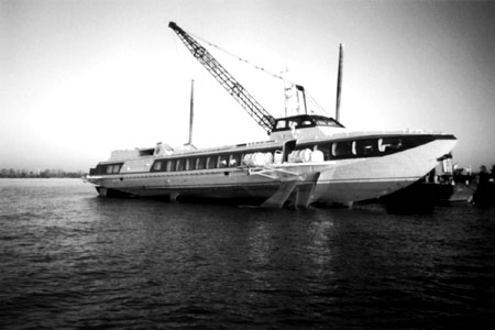 The vessel was refloated using barges and a crane, and it was found that damage to the Katran 4 had been confined to the vessel's propellers, propeller shafts, foils and struts. There was some cracking at the junction of the rudder blade to the stock and the aluminum blade was distorted about two inches to port. The only injury was sustained by the chief engineer who was passing through the engine room doorway at the time of running aground and bumped his head on the metal frame, receiving a minor head injury, which did not require hospitalization or stitches.