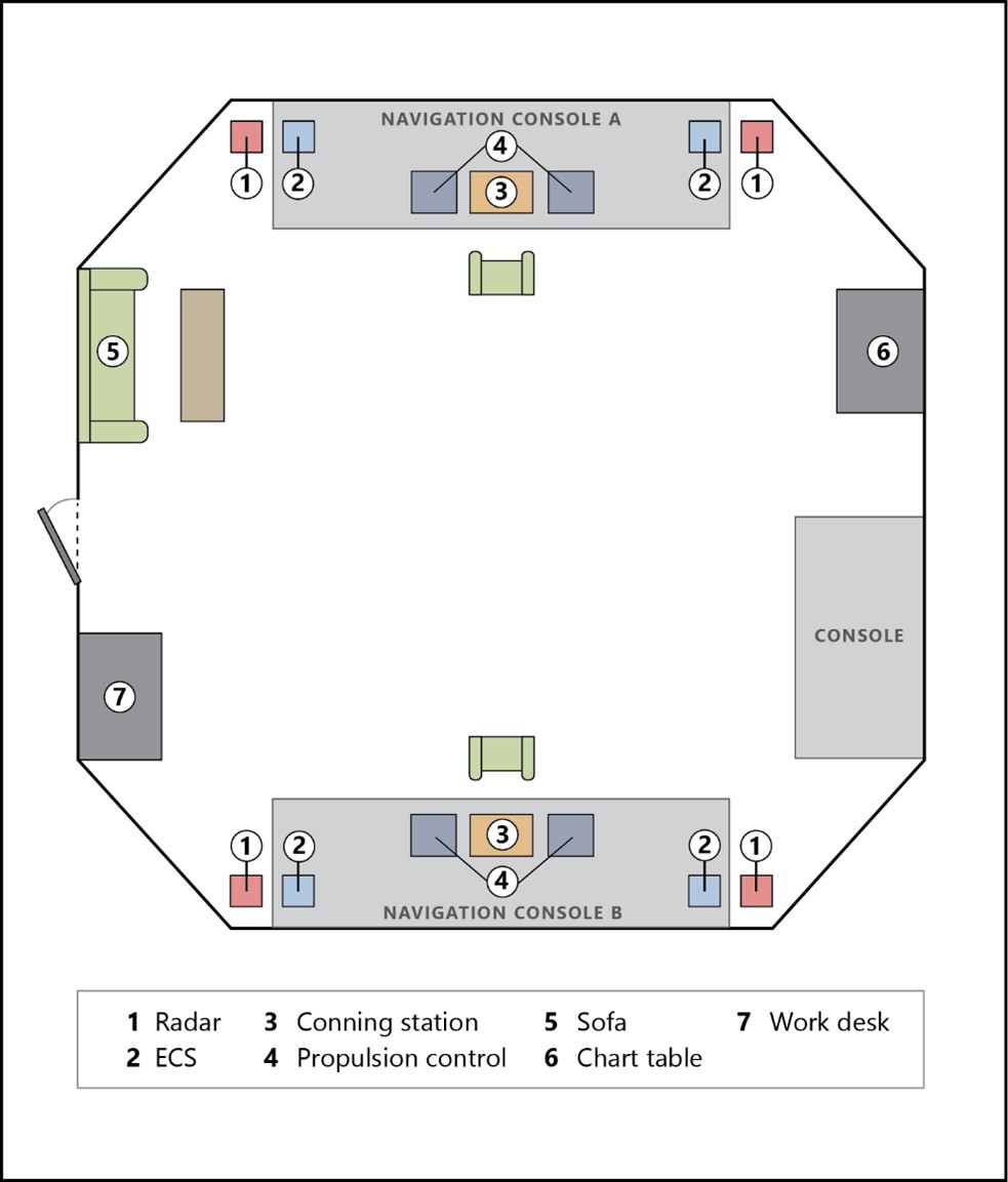 The ferry is certified to carry 289 passengers and 11 crew members, and is designed to carry 104 cars. The bridge is equipped with all required navigational equipment. Two identical navigation consoles (Figure 2) are located on the bridge, 1 at either end. Each navigation console consists of a conning station, propulsion control, an X-band (3 cm) and an S-band (10 cm) radar, and an electronic chart system (ECS) that displays data from the vessel’s automatic identification system (AIS). The ferry is also equipped with a global positioning system (GPS), a voyage data recorder (VDR), and a foghorn that can be operated manually and automatically.
