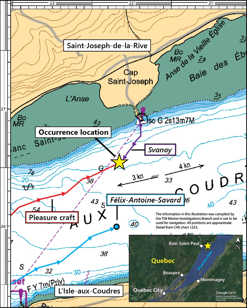 The morning of the collision, the pleasure craft had departed a marina in Québec, Quebec, bound for Tadoussac, Quebec. The pleasure craft operator and 3 other occupants kept a visual and auditory lookout while monitoring traffic via an unregistered automatic identification system. Just before the collision, the pleasure craft operator noticed that 1 of the automatic identification system targets had changed from being static to being on a collision course. The operator then saw the silhouette of the Svanoy appear from the fog. The operator immediately pulled the craft’s throttles back and altered course to port, but was unable to avoid the collision.