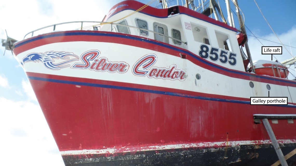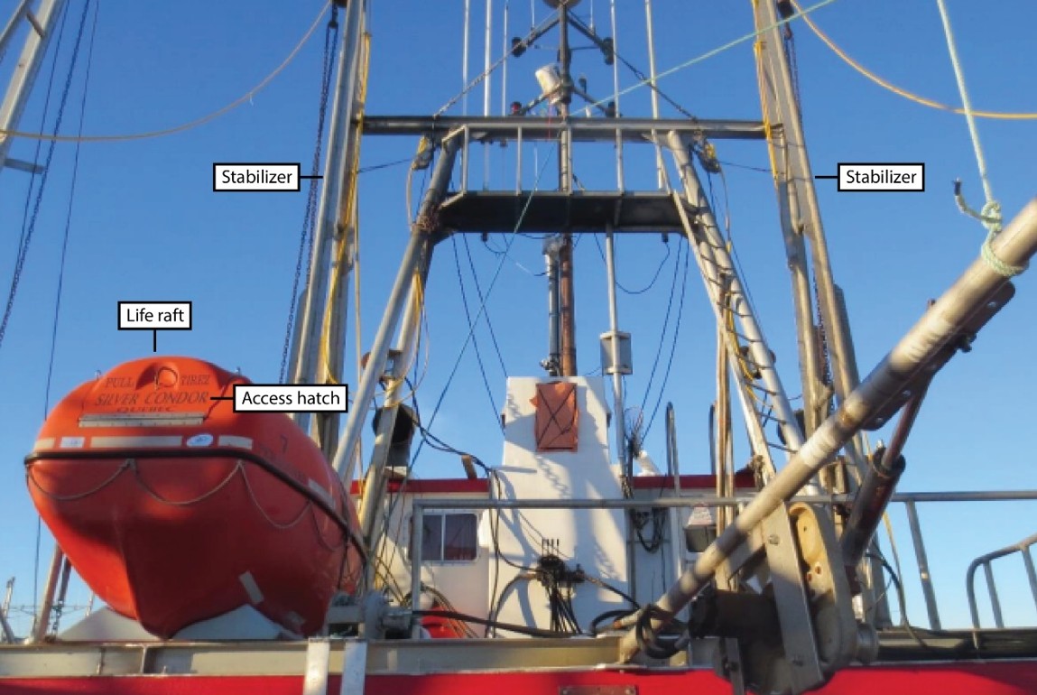 The vessel’s life raft was recovered 8 days after the occurrence by a fishing vessel, indicating that the HRU activated. At the time of the occurrence, the Silver Condor’s life raft was secured to the port side of the upper deck, behind the wheelhouse, under fishing gear. It is possible that the cables, stabilizers, and wheelhouse bulkhead prevented the life raft from floating freely after its HRU activated.