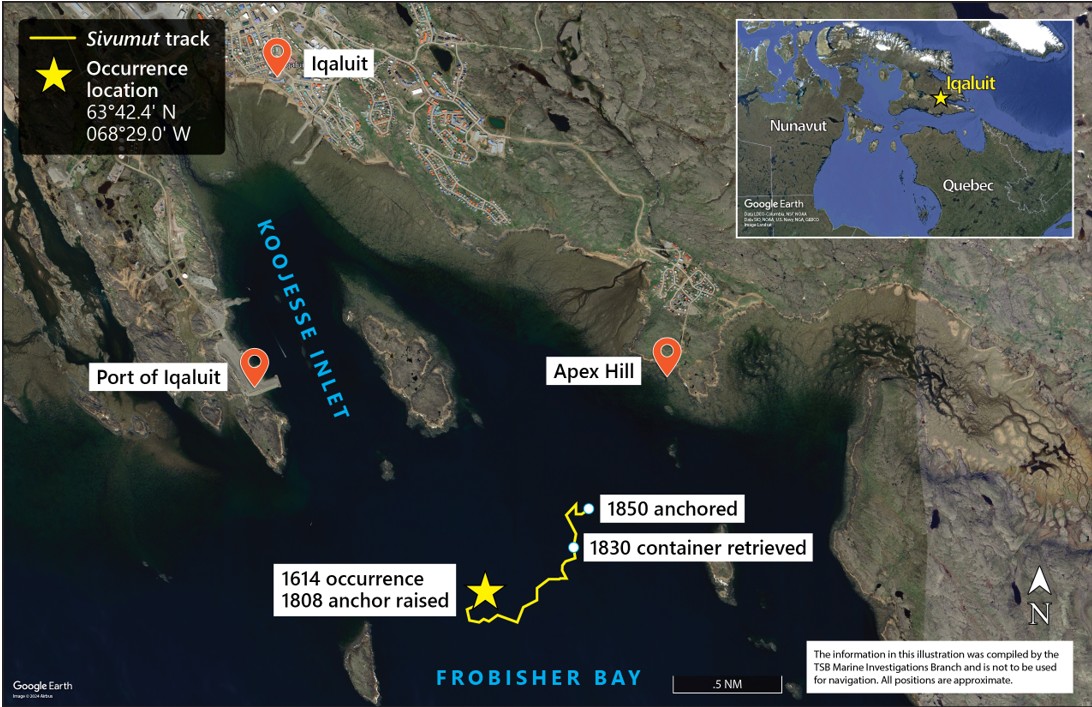 On 18 October 2023, the Sivumut departed Bécancour carrying approximately 14 995 m3 of cargo bound for Iqaluit, and 240 m3 of cargo bound for Saglek, Newfoundland and Labrador. On 23 October 2023, the Sivumut anchored in Frobisher Bay, Nunavut, less than 2 nautical miles (NM) from the port of Iqaluit while another sealift vessel occupied the dock (Figure 4).
