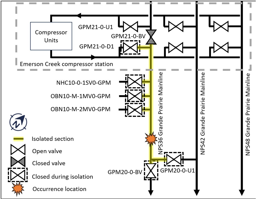 On 16 April 2024, at approximately 1045,All times are Mountain Daylight Time. a 36-inch (914 mm) pipeline owned by NOVA Gas Transmission LtdOn 14 May 2024, the entity NOVA Gas Transmission Ltd. (NGTL) was dissolved, and ownership was transferred to NGTL GP Ltd. on behalf of NGTL Limited Partnership. As the occurrence took place before the transition date, NGTL will be used throughout the report. The NGTL system is operated by TransCanada PipeLines Limited (TCPL), referred to herein by the tradename TC Energy. (NGTL)—the NPS [nominal pipe size] 36 Grande Prairie Mainline pipeline (NPS 36 Grande Prairie Mainline)—ruptured at Kilometre Post 36.5. The escaping sweet natural gas ignited and burned until the fire self-extinguished at 1345. The flow of gas to the ruptured section was stopped by closing valves upstream, at the Emerson Creek compressor station, and downstream of the rupture.