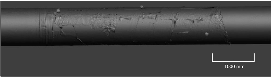 The pipe coating was analyzedThe analysis was performed using Fourier transform infrared spectroscopy. and determined to be high-density polyethylene tape coating. The double-layer tape coating was initially bonded with polyisobutylene and silicate minerals. The tape coating was assessed with the use of 3-dimensional laser scanning. The pipe was scanned with the remaining tape coating still in place, followed by a scan with the disbonded tape removed. A final scan was conducted after the pipe was sandblasted to remove all remaining tape coating and reveal the corroded pipe surface. An example coating assessment scan is presented in Figure 10. Where tape remained on the recovered pipe sections, a considerable area was found to be disbonded. Corrosion, where present, tended to follow areas of coating disbondment and tape wrap lines.