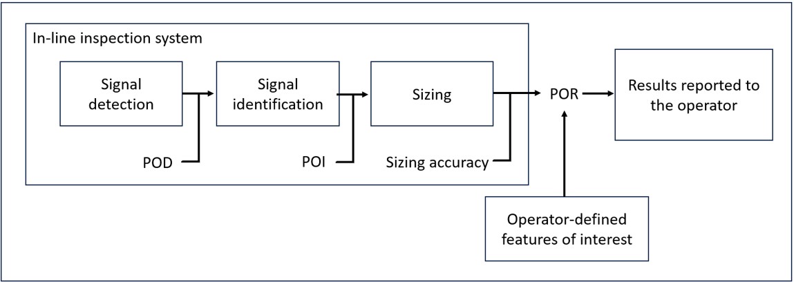 The probability that a sensor signal will be correctly identified as a specific feature type is known as the probability of identification (POI). An ILI tool performance specification must clearly state a statistically derived POI. Similarly, an inspection tool must state a statistically derived sizing accuracy.