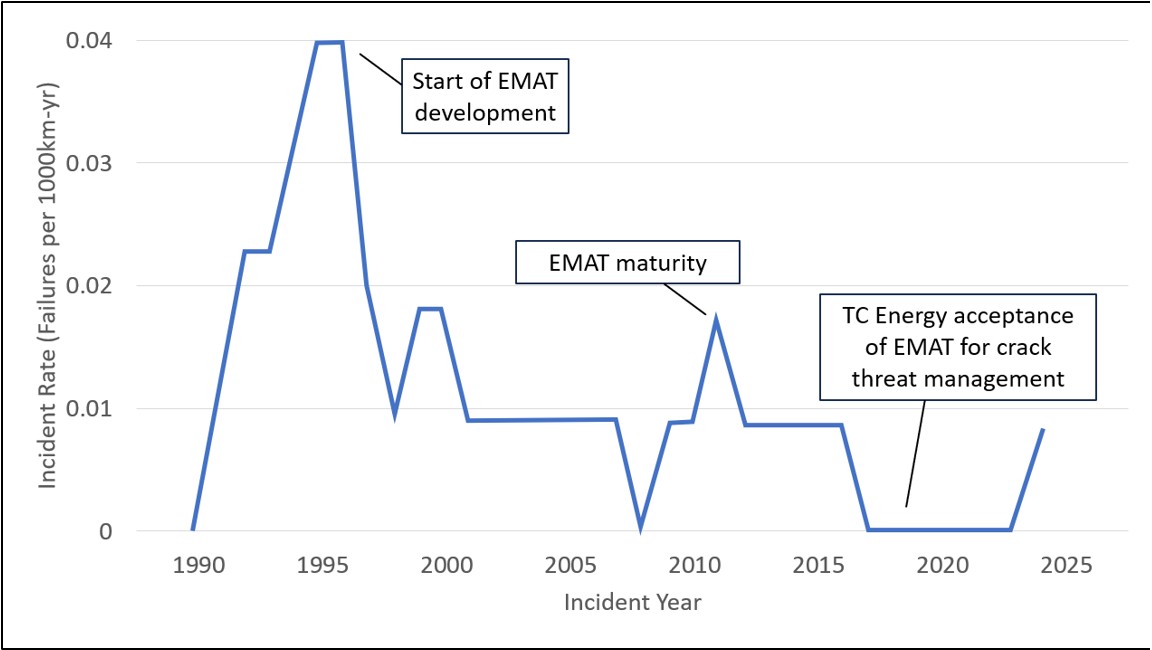 TC Energy utilizes EMAT ILIs to manage the threat of SCC. On an ongoing basis, TC Energy provides inspection service providers with information about crack sizes as found in the field to improve the capabilities of the tools and the associated data analysis. Based on TC Energy’s excavation data, EMAT tools have consistently exceeded their stated accuracy specifications for sizing cracks, and since 2018, TC Energy has used this type of inspection as the primary method for managing SCC on its pipelines. Despite the continual improvements of the technology, pipeline operators are aware that the probability of detection, identification, sizing, and reporting of cracks from an EMAT inspection is subject to uncertainties inherent to the capabilities of the tool and the analysis of inspection data.