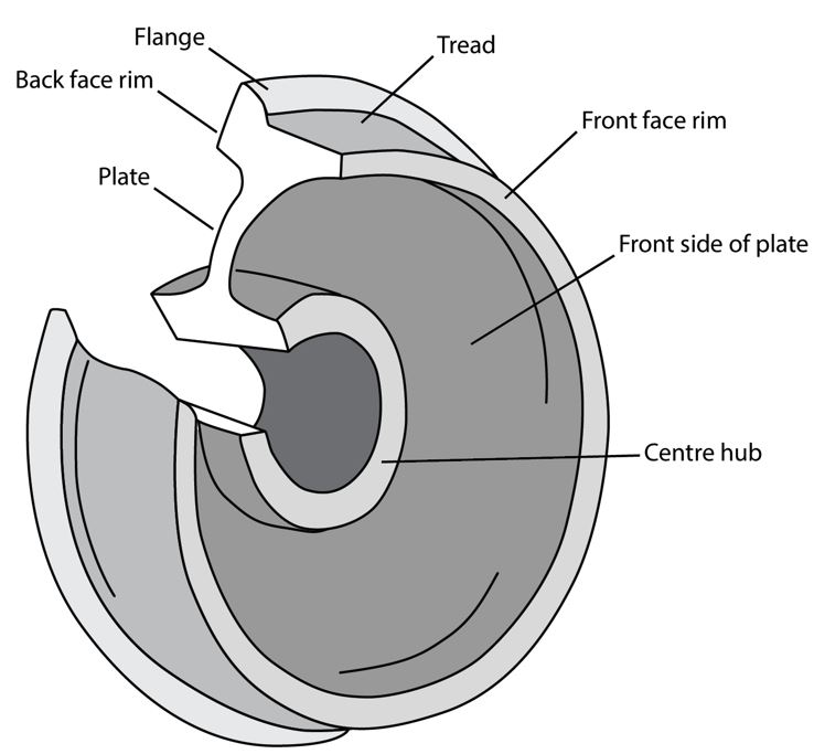 The wheel plate is a critical structural element of a freight car wheel. It is the thinnest section of the wheel.