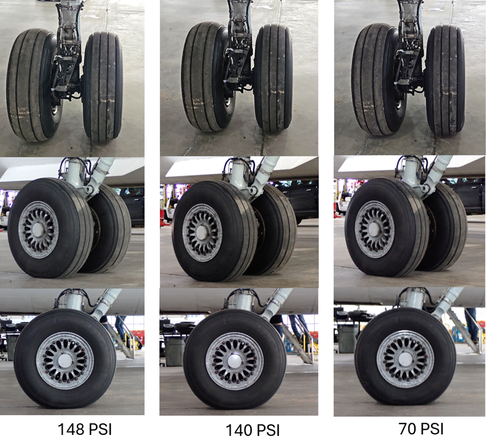 After the occurrence, the TSB investigation team inflated an exemplar tire to different tire pressures to determine if there were changes in the tire’s visual appearance. With the aircraft in the weight-on-wheels condition, differences were negligible in the appearance of the tires when pressurized to 148 psi and 140 psi, and when inflated to a pressure significantly lower than the acceptable range, such as 70 psi (Figure 1). In fact, the investigation team was only able to visually detect a significant change in the tire side wall when the inflation pressure was critically low.