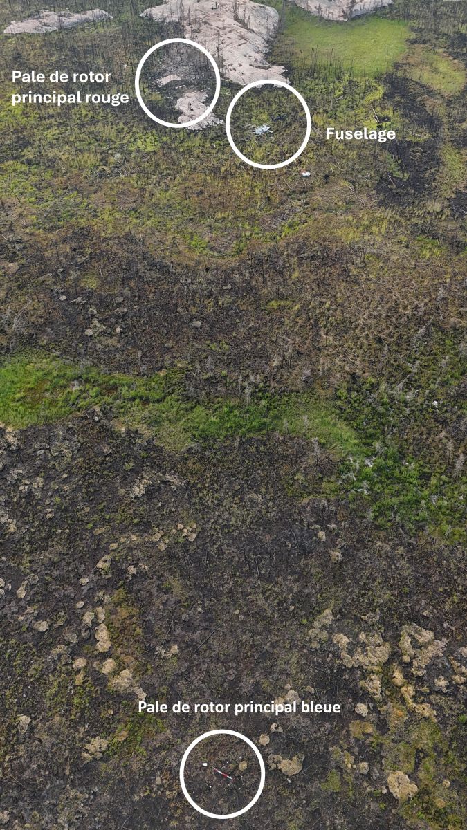 Lors de l’approche pour livrer une charge externe de jeunes arbres, le bruit produit par l’hélicoptère a perceptiblement changé et l’hélicoptère a commencé à tourner sur son axe vertical. L’hélicoptère a ensuite subi une désintégration en vol et une partie d’une des pales principales s’est séparée du moyeu du rotor principal. À la suite de la séparation de la pale, le moyeu principal, l’ensemble de pales et la transmission se sont détachés du fuselage.