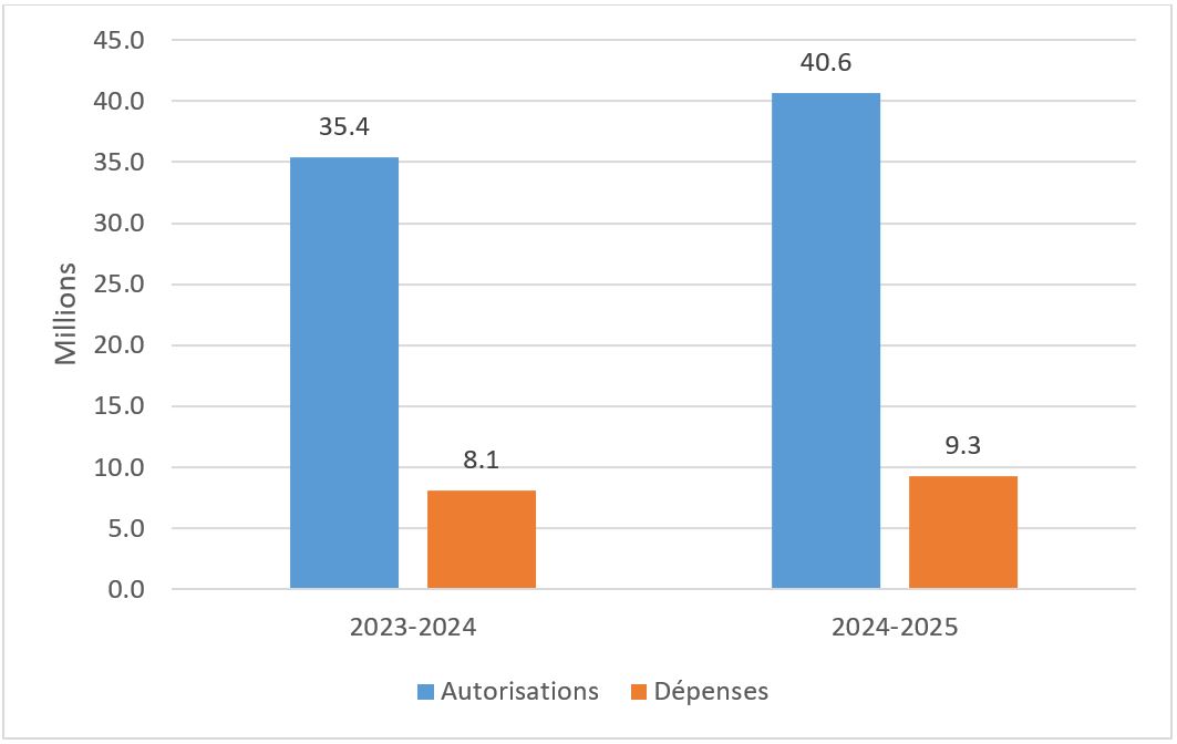 Le montant total des autorisations disponibles pour utilisation du BST ont augmenté de 5,2 millions de dollars entre les exercices financiers 2023-2024 et 2024-2025. Cette augmentation importante est principalement attribuable au financement supplémentaire récemment obtenu dans le Budget 2023, qui a prévu des ressources pour les besoins opérationnels essentiels du BST, y compris l'embauche de nouveaux enquêteurs et des investissements nécessaires en technologies de l'information. En outre, le BST a obtenu des fonds pour les augmentations salariales des employés découlant des conventions collectives récemment signées et ratifiées. Ces augmentations sont partiellement contrebalancées par des économies à l'échelle gouvernementale dans le cadre de l'initiative de recentrage des dépenses du gouvernement du Canada.