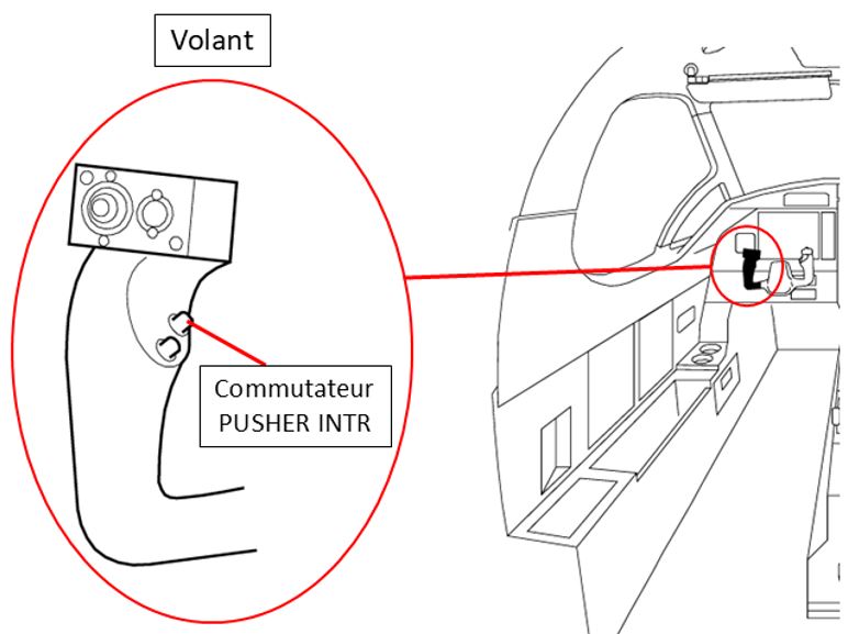 Chaque poignée extérieure de volant est équipée d’un commutateur PUSHER INTR (figure 2) qui, tant qu’il demeure enfoncé, permet au pilote de désactiver rapidement le pousseur et de déplacer librement les gouvernes de profondeur à partir du poste de pilotage à l’aide du manche.