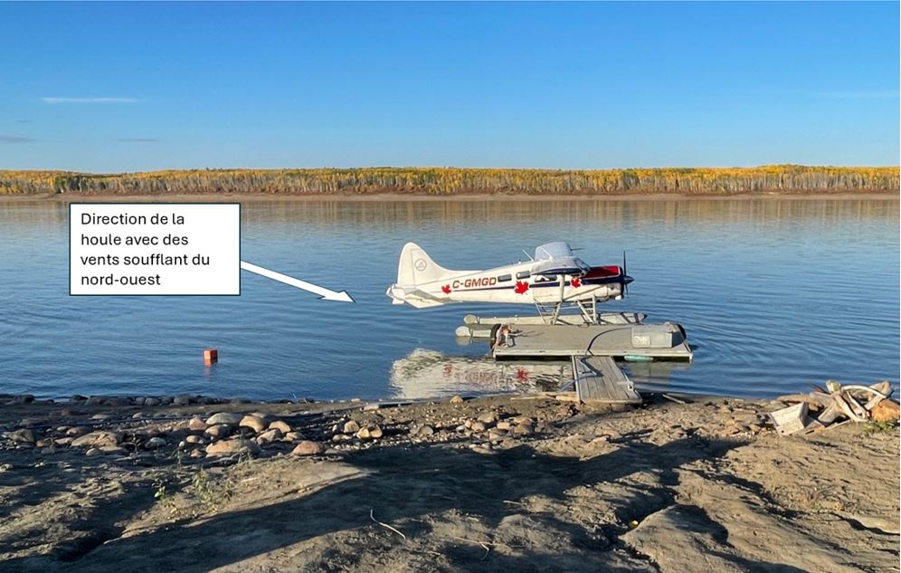 Le jour de l’événement, le niveau d’eau du fleuve Mackenzie était bas au quai à CEZ7 et les vents soufflaient du nord-ouest au-dessus de 10 nœuds, si bien qu’une houle frappait l’avion de l’arrière gauche à environ 45° (figure 2) jusqu’à son axe longitudinal. Cette condition peut donner l’impression que le réservoir de carburant est plein au niveau du col de remplissage. Pendant le ravitaillement, la houle était suffisante pour que le carburant soit ballotté et éclabousse les vêtements du pilote. Le pilote vérifie normalement les jauges de carburant avant de décoller, mais ne se souvient pas si cela avait été effectué pour le vol à l’étude.