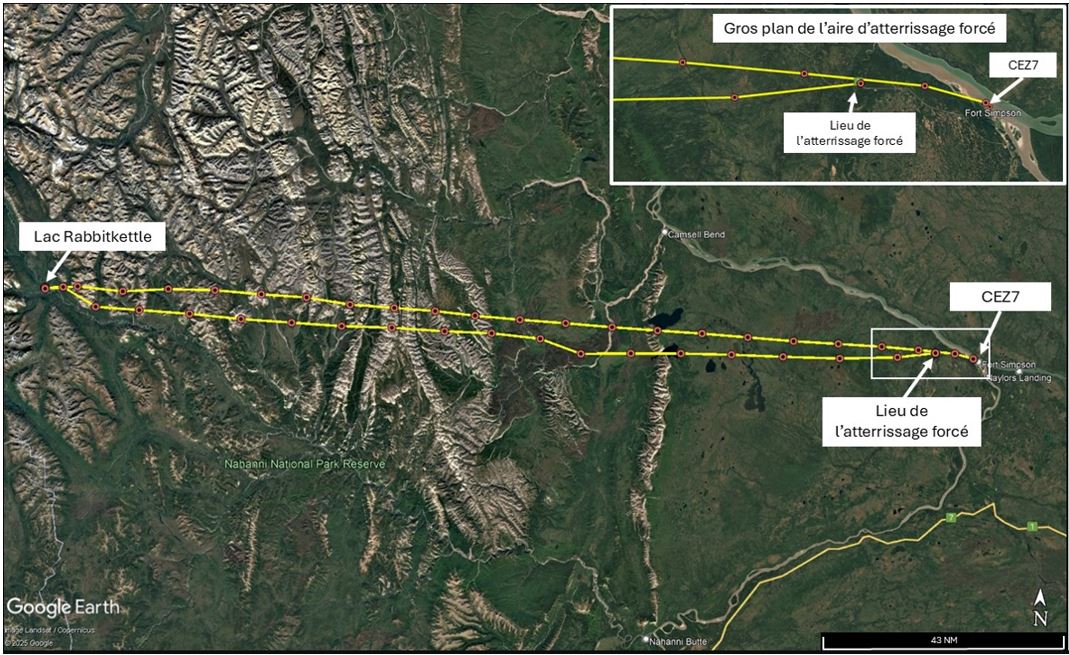 Vers 12 h 40, le pilote s’est souvenu que la jauge de carburant indiquait un réservoir vide. Encore une fois, cela s’est produit plus tôt qu’il ne l’avait prévu. À ce moment-là, il a commencé à envisager des options au cas où les indications de la jauge de carburant seraient exactes. En l’absence d’autres options viables, le pilote s’est dirigé vers la route du Mackenzie et l’a suivie au cas où un atterrissage d’urgence serait nécessaire. Lorsque l’aéronef se trouvait approximativement à 8 NM à l’ouest de CEZ7, à environ 1500 pieds au-dessus du sol (AGL), le moteurLe moteur est un Pratt & Whitney-USA, R-985-AN-14B. a subi une perte complète de puissance. Le pilote a pu effectuer un atterrissage forcé sur la route, atterrissant vers 12 h 50, 7 NM à l’ouest de CEZ7 (figure 3).