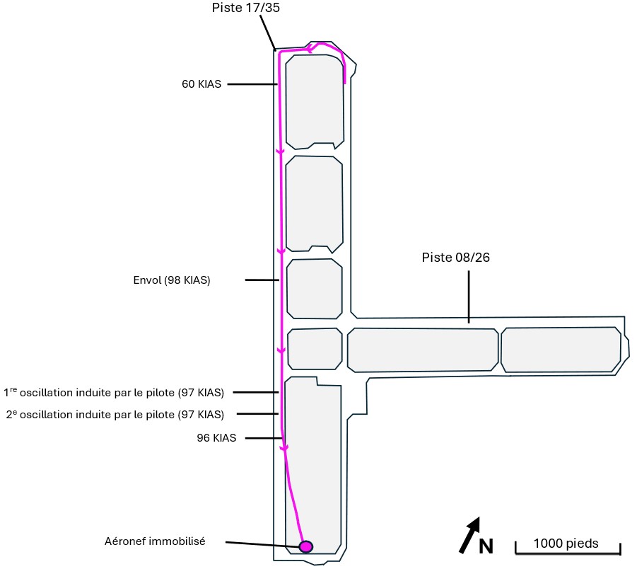 Lors de la 2e tentative, l’aéronef a gagné environ 10 à 20 pieds de hauteur et atteint une vitesse maximale de 98,4 KIAS. Lorsque l’aéronef a franchi le seuil de la piste 08, et à une vitesse de 97 KIAS, le pilote a interrompu le décollage, car il lui a de nouveau semblé que la performance de l’aéronef était inférieure à ce qu’il avait prévu. L’aéronef est descendu et le train d’atterrissage avant a touché la piste en premier. L’aéronef a ensuite rebondi, a repris son envol, est entré dans une oscillation induite par le pilote (PIO)Voir la section intitulée Oscillation induite par le pilote du présent rapport pour obtenir une description de ce phénomène., puis a dérivé vers la gauche de la surface pavée de la piste. L’aéronef est descendu et a percuté la zone gazonnée du côté gauche (est) de la piste 17 (figure 1).