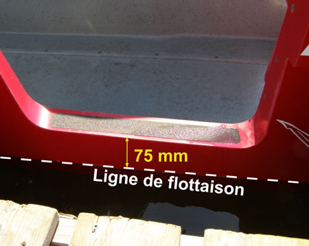 Cet essai a pour but de démontrer qu'il y a une marge de franc-bord suffisante pour le bateau en charge. Au moment de l'évaluation de la stabilité, la porte n'était pas considérée comme une ouverture d'envahissement. Aux fins de cet essai, le point d'envahissement le plus bas n'était donc pas le seuil de porte mais plutôt le dessus du plat-bord à l'arrière, qui est à 630 mm au-dessus de la flottaison en condition de pleine charge. L'essai exigeait une hauteur minimale de 500 mm. Le bateau était donc conforme vu qu'on a mesuré à partir du plat-bord à l'arrière.
