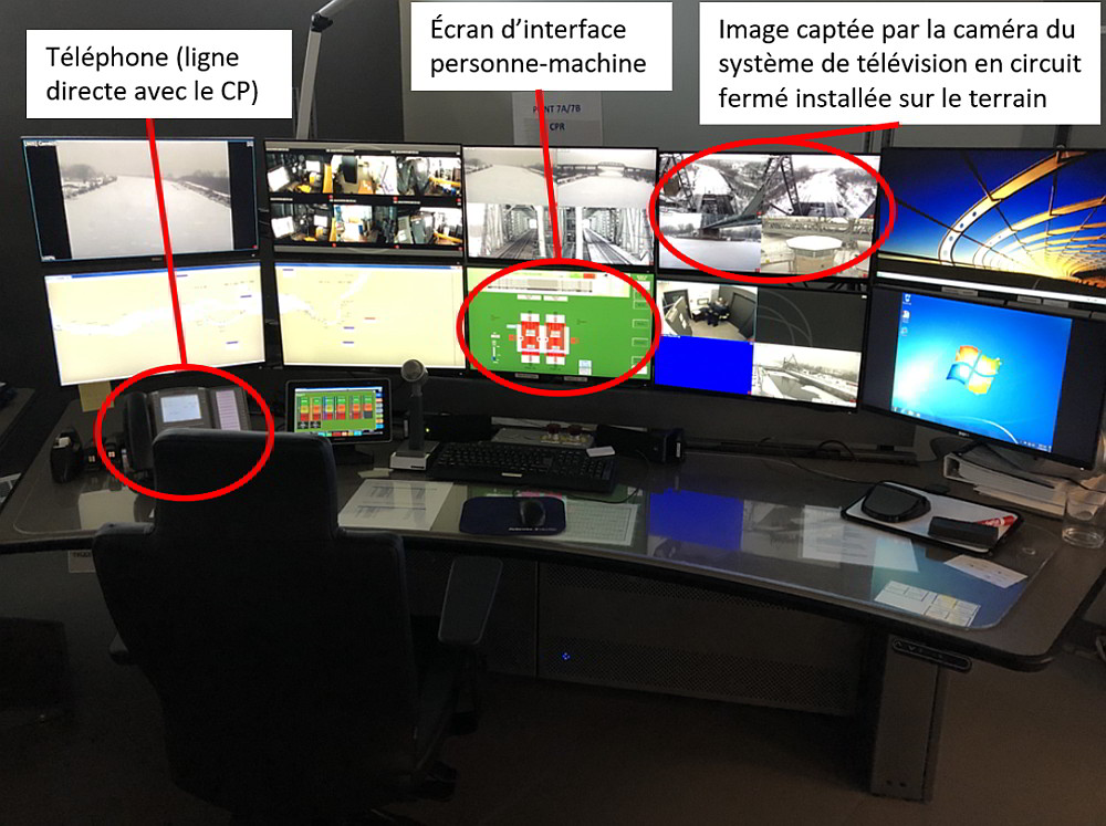 Le poste de travail utilisé pour contrôler les ponts 7A et 7B comprend un écran d'interface personne-machine ainsi que plusieurs écrans présentant les images captées par des caméras du système de télévision en circuit fermé installées à l'écluse Côte Sainte-Catherine, sur les ponts et sur la structure du canal. Il est aussi doté d'une ligne téléphonique directe avec le contrôleur de la circulation ferroviaire du CP (figure 4).