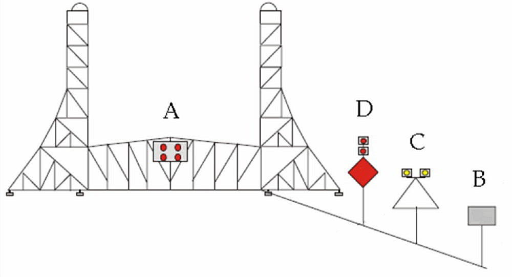 Pour fournir aux navires en approche de l'information sur l'état de chaque pont, deux jeux identiques de signaux sont installés de part et d'autre de chaque pont. Ces jeux de signaux sont constitués de feux de navigation installés sur chaque pont et d'un ensemble de trois panneaux de rive installés à diverses distances du pont (figure 5).