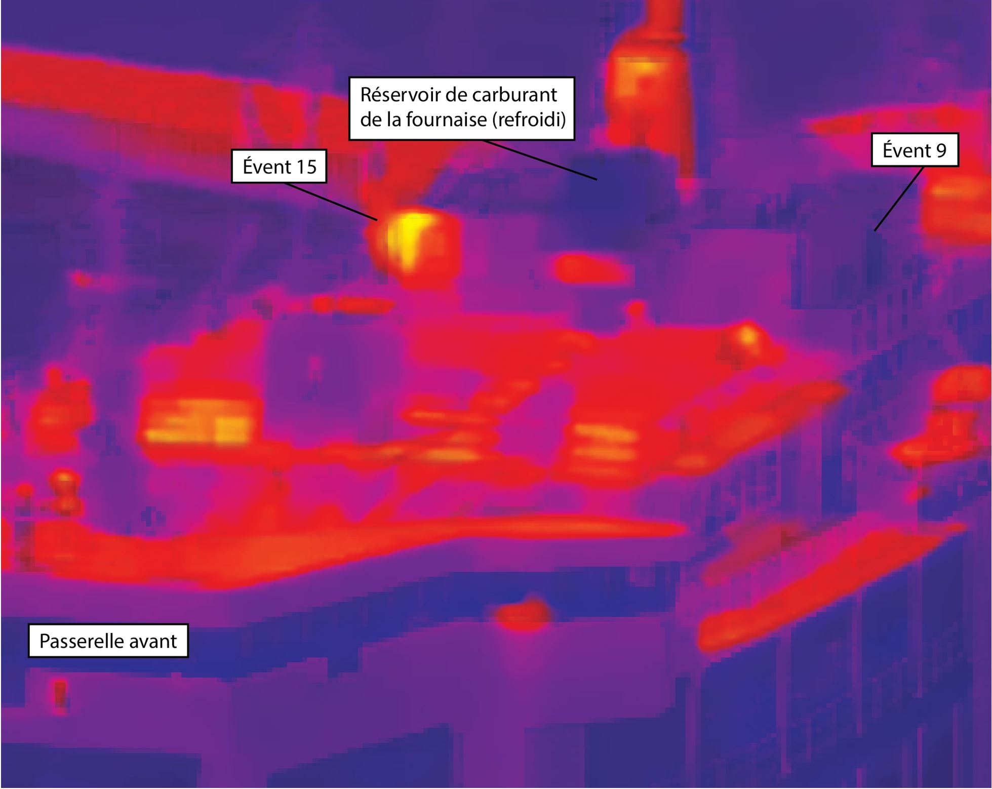 Avec les pompiers supplémentaires, le refroidissement du périmètre a été étendu au pont du rouf supérieur et au pont de cheminée, où se trouvait le réservoir de carburant de la fournaise des quartiers d’équipage. À ce moment-là, le mécanicien adjoint et un pompier ont remarqué qu'une importante quantité de fumée s’échappait du ventilateur d’admission d’air de la salle des machines (l’évent 15). Ils ont tenté de pénétrer dans l’espace, mais il y avait trop de fumée pour y voir et il y faisait trop chaud. Les pompiers ont surveillé les températures à l’aide de caméras thermiques à bord et d’un drone (figure 5). Au moment où les pompiers ont commencé le refroidissement du périmètre sur le pont de cheminée, la température de la cheminée était d’environ 113 ℃ et celle du réservoir de carburant de la fournaise, d’environ 90 ℃.