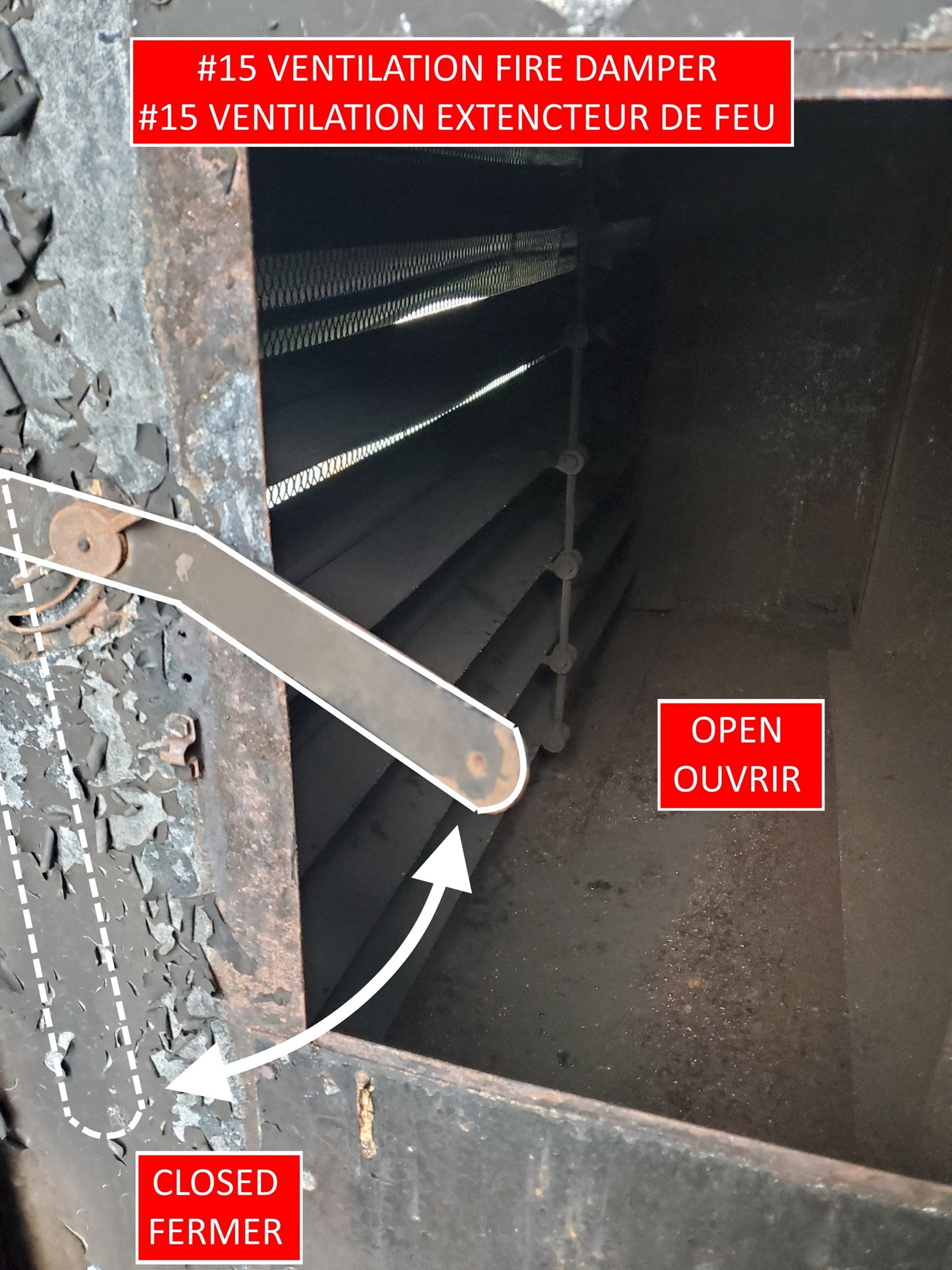 Le matelot de pont 4 est allé fermer les évents d’admission d’air 9 et 15Les évents 9 et 15 sont les évents d’admission d’air de la machine principale. Ils sont restés ouverts pendant toute la durée de l’événement. situés sur le pont du rouf supérieur, qui devaient être fermés de l’intérieur de la salle des ventilateurs. La poignée de l’évent 9 était en position fermée. À l’évent 15, il faisait trop chaud et il y avait trop de fumée dans la salle des ventilateurs pour être en mesure d'y entrer. Le matelot de pont 4 a donc fermé la porte d’un coup de pied de l’extérieur.