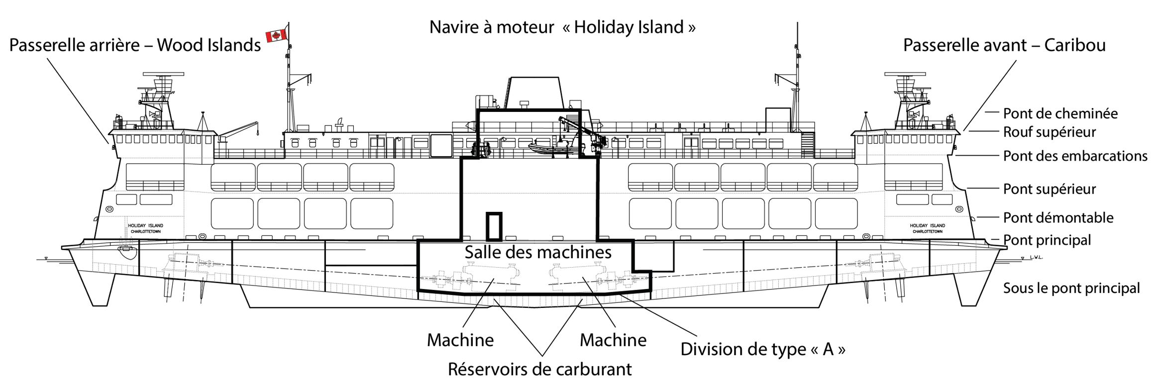 Les 2 passerelles ferméesSur le Holiday Island, la convention était de désigner la passerelle faisant face à Caribou (Nouvelle-Écosse) comme la passerelle avant et la passerelle faisant face à Wood Islands (Île-du-Prince-Édouard) comme la passerelle arrière, peu importe le sens de la marche. De façon similaire, les côtés bâbord et tribord sont toujours les mêmes. Le présent rapport suit la même convention. , les quartiers d’équipage et les bureaux étaient situés sur le pont des embarcations. Chaque pont était équipé de ce qui suit :