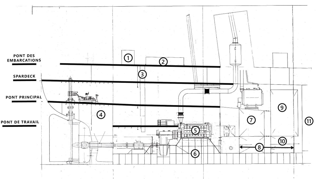 1 Salle de CO2, 2 Claire-voie, 3 Évent, 4 Coqueron arrière, 5 Machine principale, 6 Plafond de ballast, 7 Lest liquide, 8 Tunnel de déchargement (menant à la cale), 9 Réservoir de carburant, 10 Réservoir de jour de mazout, 11 Cale.