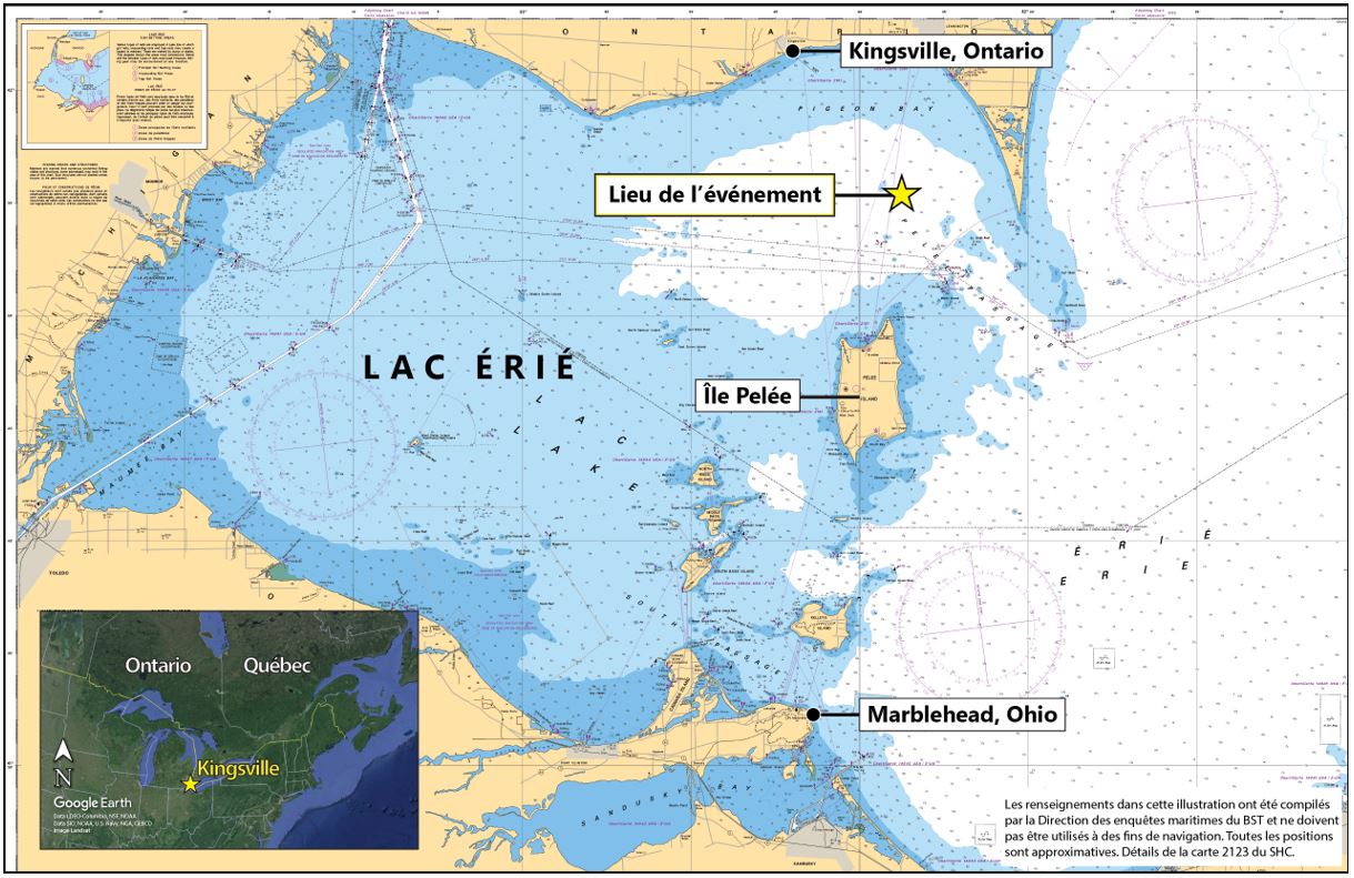 Le 23 mai 2023, à 19 h 14Les heures sont exprimées en heure avancée de l’Est (temps universel coordonné moins 4 heures)., le Cuyahoga a quitté Marblehead (Ohio), aux É.-U., en direction de Kingsville (Ontario) (figure 3), ce qui représente un voyage d’environ 4 heures. Le navire était chargé de 11 400 tonnes métriques de pierre concassée de granulométrie A.