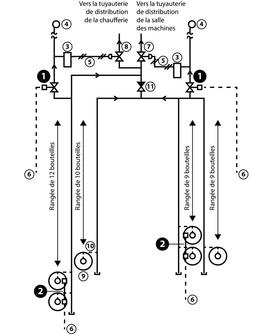 - Inspectez l’assemblage des bouteilles de dioxyde de carbone et des vannes pour déceler la présence de fuites, de dommages physiques comme des fissures, des bosselures, de la distorsion, et de pièces usées. Vérifiez s’il y a des dommages à l’opercule de sécurité et remplacez-le au besoin. Au besoin, nettoyez la bouteille et les parties associées selon les instructions au paragraphe 6-6.3.
