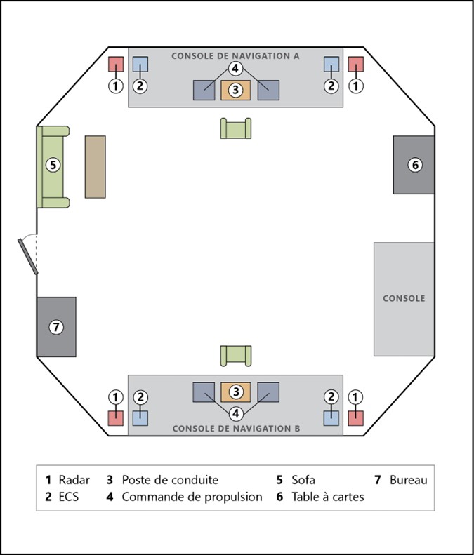Le traversier est certifié pour transporter 289 passagers et 11 membres d’équipage, et il est conçu pour transporter 104 voitures. La passerelle est munie de tout l’équipement de navigation requis. Deux consoles de navigation identiques (figure 2) sont situées sur la passerelle, 1 à chaque extrémité. Chaque console de navigation comprend un poste de conduite, une commande de propulsion, un radar en bande X (3 cm) et un radar en bande S (10 cm), ainsi qu’un système de cartes électroniques (ECS) qui affiche les données du système d’identification automatique (AIS) du navire. Le traversier est aussi muni d’un système de positionnement mondial (GPS), d’un enregistreur des données du voyage (VDR) et d’une corne de brume qui peut être actionnée manuellement et automatiquement.