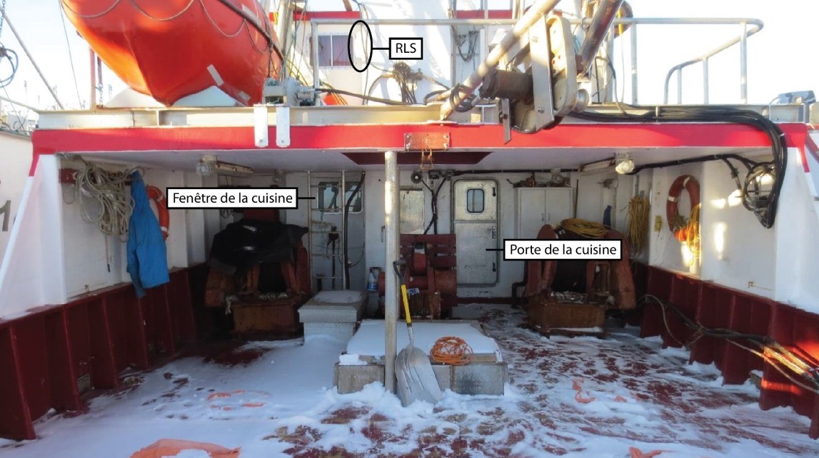Les quartiers de l’équipage étaient divisés en une cuisine et 4 cabines; le capitaine avait une cabine attenante à la timonerie, et les 3 autres cabines étaient situées sur le pont principal, à l’avant de la cuisine. Trois des cabines contenaient chacune 1 couchette, et 1 cabine contenait 4 couchettes. La cuisine avait un hublot sur son côté bâbord ainsi qu’une fenêtre et une porte sur le mur arrière; le hublot et la fenêtre pouvaient tous deux être ouverts de l’intérieur (figures 5 et 6).