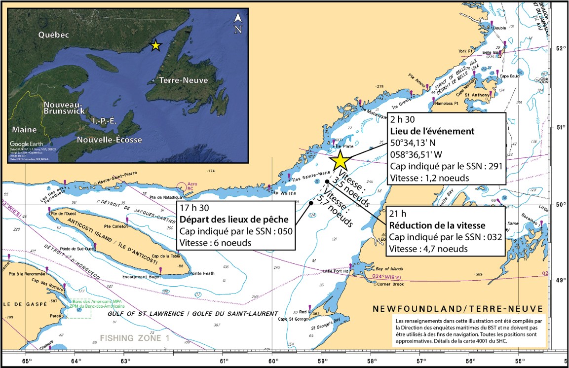 Le bateau a navigué pendant environ 15 heures jusqu’au lieu de pêche situé au sud de Harrington Harbour (Québec), à environ 100 milles marins (NM) au sud-ouest de Rivière-Saint-Paul. Le 22 septembre, vers 2 h, l’équipage a commencé à pêcher le sébaste.