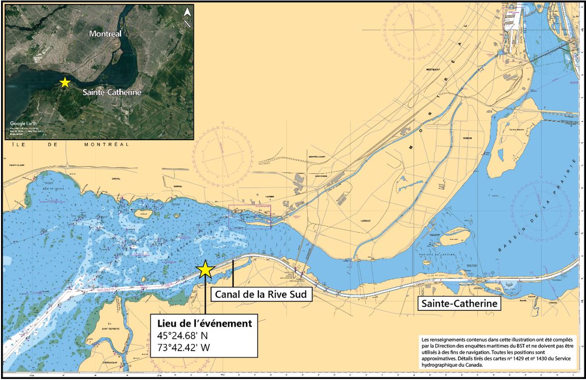 Le 22 août 2024, vers 16 h 40Les heures sont exprimées en heure avancée de l’Est (temps universel coordonné moins 4 heures)., le Heemskerkgracht a quitté le port de Côte-Sainte-Catherine après avoir chargé 10 350 tonnes de ferraille d’acier en vrac. Le navire faisait route vers Huelva, en Espagne. Le navire a commencé à se diriger vers l’ouest dans le canal de la Rive Sud en direction du lac Saint-Louis pour faire demi-tour. L’équipe à la passerelle était alors composée d’un pilote de l’Administration de pilotage des Grands Lacs, du capitaine, d’un timonier et du premier officier, qui était l’officier de quart. Le deuxième mécanicien était de quart dans la salle des machines; le chef mécanicien avait quitté la salle des machines après le départ.