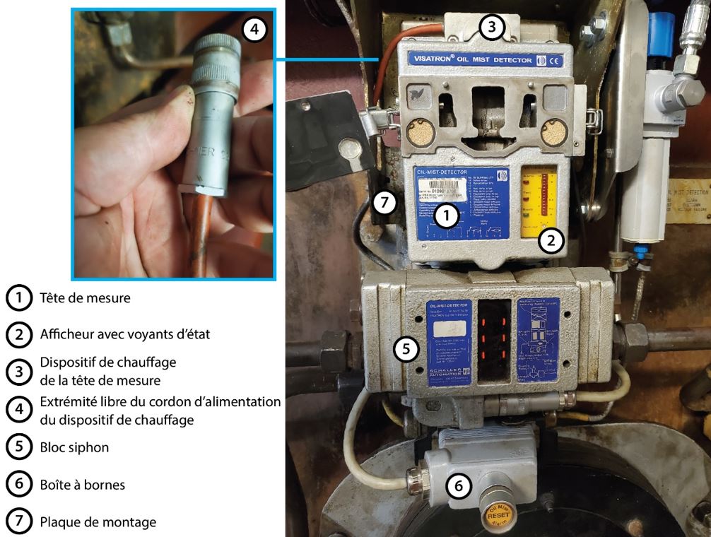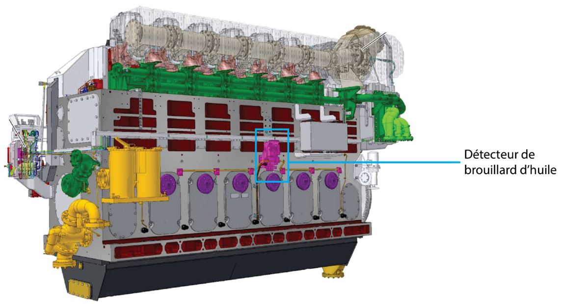 La Convention internationale pour la sauvegarde de la vie humaine en mer (1974) (SOLAS) exige que certaines machines diesel marines soient équipées de détecteurs de brouillard d’huile (DBH)La règle 47(2) du chapitre II-1 de la Convention internationale pour la sauvegarde de la vie humaine en mer (1974) exige que des dispositifs de détection de brouillard d’huile dans le carter soient installés sur les machines diesel dont la puissance maximale continue est supérieure ou égale à 2250 kW ou dont les cylindres ont un alésage supérieur à 300 mm. De plus, la règle 27(5) précise que l’installation de dispositifs équivalents à des dispositifs de détection de brouillard d’huile dans le carter (p. ex. des dispositifs de surveillance de température pour les roulements de la machine) est également autorisée.. Le type de DBH exigé dépend des caractéristiques de la machineAssociation internationale des sociétés de classification, Machinery shutoff arrangements – Oil mist detector arrangements, SC 228, décembre 2008, à l’adresse https://iacs.org.uk/resolutions/ui-sc/ui-sc228-new/ui-sc228-new (dernière consultation le 19 août 2025)..