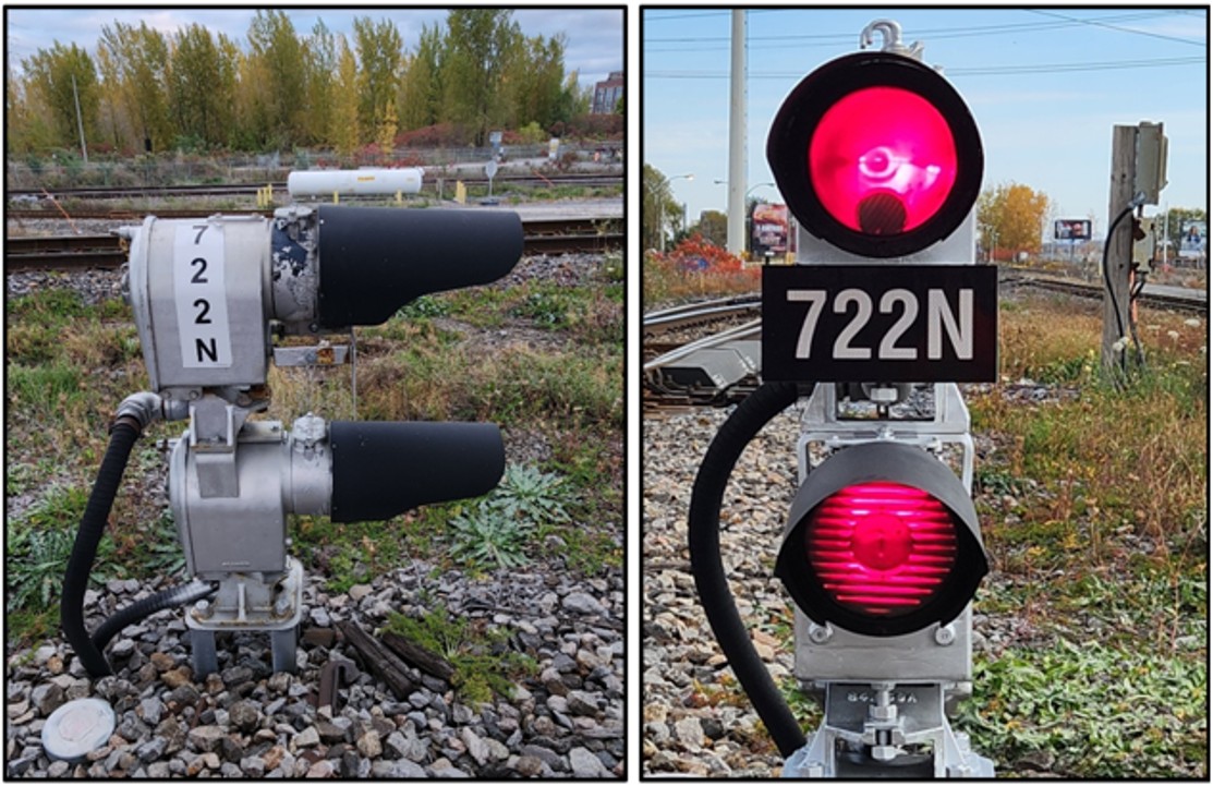 Le signal 722N est un signal à mât bas de 4 pieds de haut à oculaire mobile de modèle H-2 fabriqué par la compagnie Union Switch and Signal. Il est situé entre les voies nord et sud et, selon le CN, il est aligné pour une visibilité optimale d’une distance de 100 pieds et de 588 pieds. Ce type de signal était fabriqué à partir des années 1920. Il est constitué de 2 feux superposés dotés de mécanismes à oculaires mobiles. Chaque feu est muni d’un capot allongéÀ la suite d’un incident survenu en 2006 où il avait été déterminé que la réflexion du soleil pouvait avoir donné une teinte jaunâtre au feu supérieur, les feux du signal avaient été munis de capots allongés afin de réduire les risques d’interférence (événement de transport ferroviaire R06Q0090 du BST). qui permet d’améliorer la vue du faisceau lumineux à distance (figure 4).