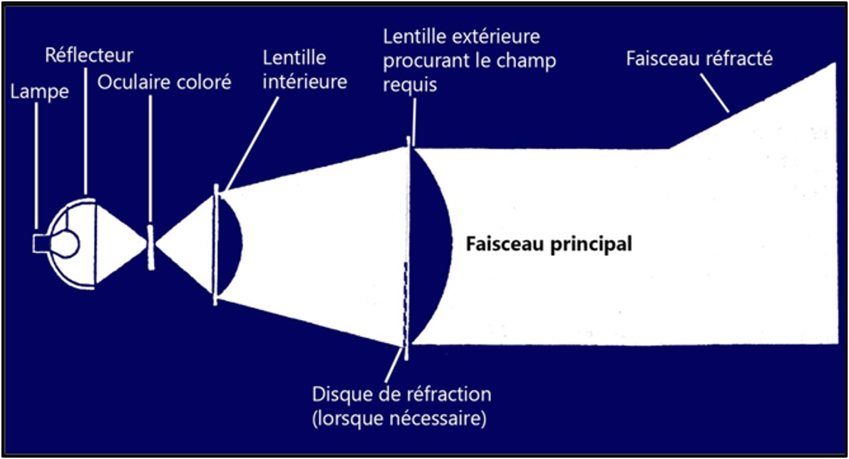 Le faisceau lumineux émis par la lampe incandescente est réfléchi par un réflecteur et traverse l’oculaire coloré, une lentille intérieure, un disque de réfractionLorsque nécessaire. et une lentille extérieureLentille ordinaire, lentille de réfraction ou lentille de diffusion.. Ces composantes sont sélectionnées et agencées de façon à orienter le faisceau lumineux en fonction du profil de la voie et de la topographie du terrain, compte tenu de la localisation du signal (figure 6).