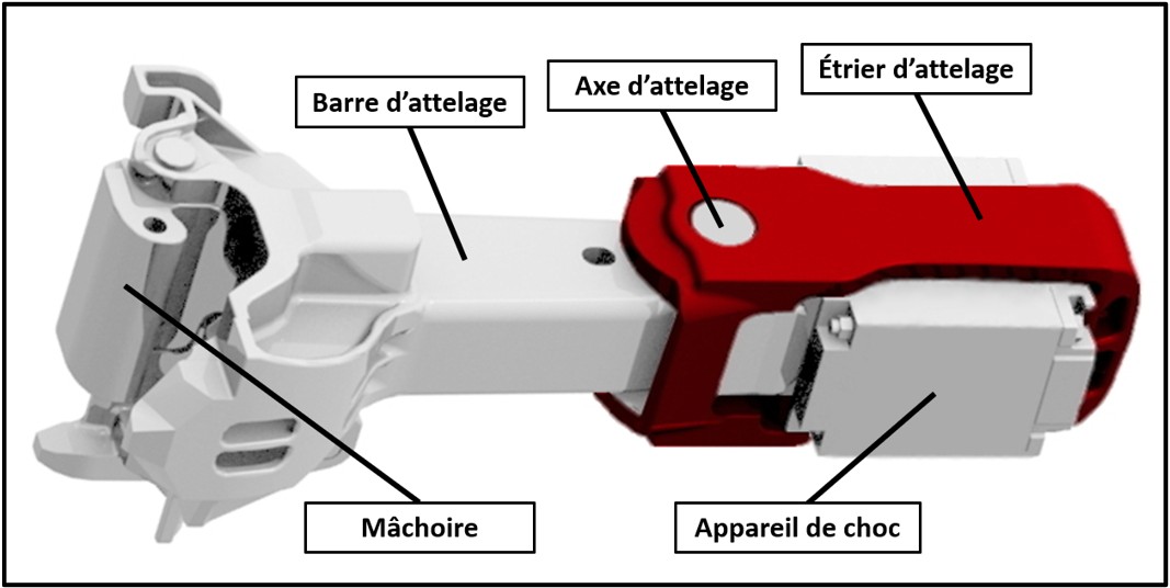 La plaque d’appui, l’étrier et l’appareil de choc font partie des composantes du dispositif d’attelage qui sont fixées à l’intérieur de la longrine centrale sous le wagon. L’axe d’attelage agit comme pivot pour la barre d’attelage, permettant à cette composante une certaine mobilité sur 2 axes de déplacement :