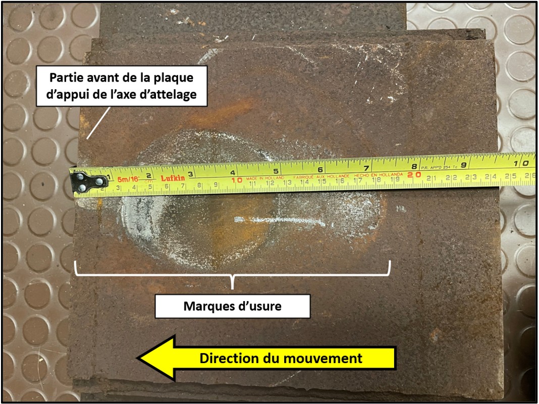 Lors de l’examen du wagon par les enquêteurs du BST, la plaque d’appui qui retient l’axe d’attelage a été démontée afin de permettre l’observation de la surface de contact de la plaque. Cette dernière présentait des marques d’usure qui s’étendaient jusqu’à son extrémité avant (figure 8).