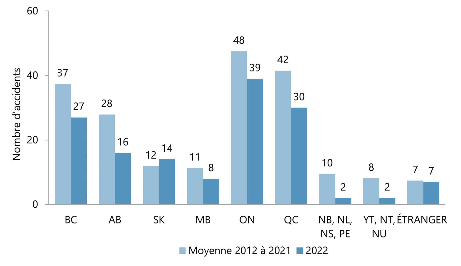 On a signalé 145 accidents mettant en cause des aéronefs immatriculés au Canada (à l’exclusion des ultralégers) en 2022 (tableau 2). Ce nombre est inférieur de 15 % au total de 170 accidents en 2021, et inférieur de 28 % à la moyenne de 203 accidents au cours des 10 années précédentes (de 2012 à 2021). En comptant les 15 accidents mettant en cause des ultralégers, il y a eu 160 accidents mettant en cause des aéronefs immatriculés au Canada en 2022.
