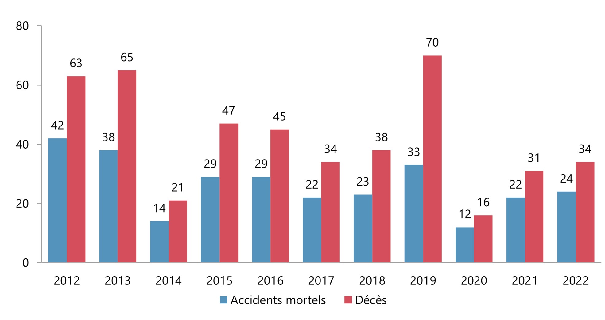 Il est à noter que certaines caractéristiques des données limitent l’analyse statistique et la détermination de tendances émergentes. Ces caractéristiques sont, entre autres, le petit nombre d’accidents et d’incidents, la grande variabilité des données d’une année à l’autre, et les changements à la réglementation et aux définitions. Nous rappelons au lecteur de tenir compte de ces limites durant la lecture du présent sommaire afin d’éviter de tirer des conclusions que l’analyse statistique ne pourra appuyer.