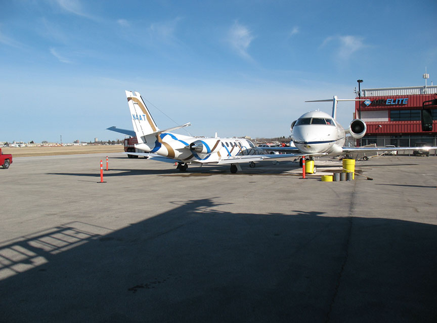 In the afternoon of , a privately registered Cessna C550 Citation Bravo aircraft was preparing to depart from the Winnipeg James Armstrong Richardson International Airport, Manitoba for Bedford, Massachusetts. After the engines were started under the guidance of a ground marshaller, the C550 began to taxi for the departure. During the initial turn from the parking area, aircraft control was lost and the C550's right wing collided with the nose gear of a parked Bombardier CL-600-2B16 aircraft (Challenger 605). The pilot of the C550 subsequently shutdown the aircraft and exited with the sole passenger on board.