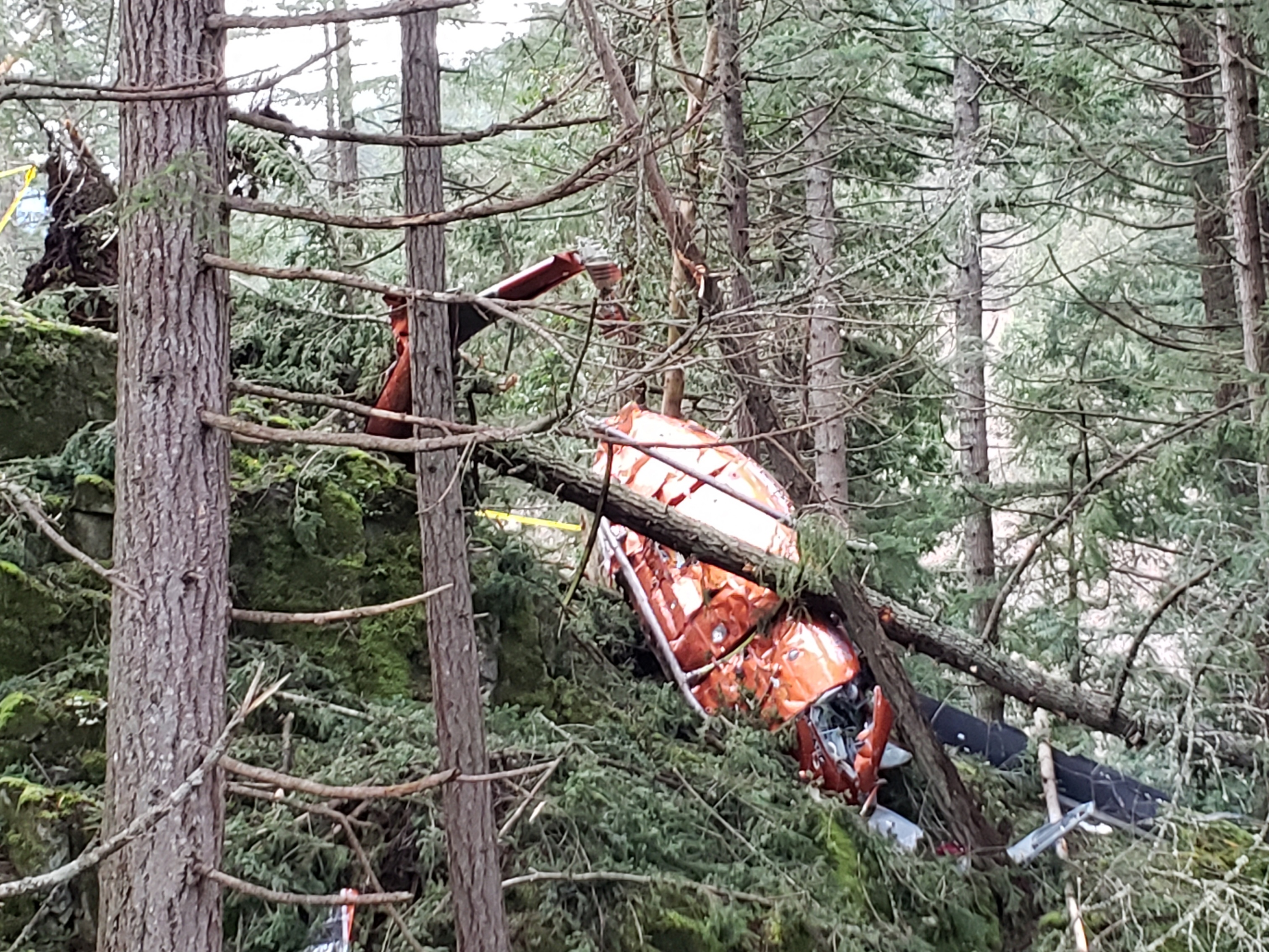 A location on nearby Bowen Island, British Columbia, was selected for an emergency landing; however, the helicopter was still difficult to control and the pilots were unable to manoeuvre it to the desired location. During the descent, the helicopter began a rapid rotation to the right, which the pilots were unable to arrest. After several rotations, the helicopter collided with trees and came to rest on a rocky ridge approximately 270 feet above sea level on the northwest corner of Bowen Island.