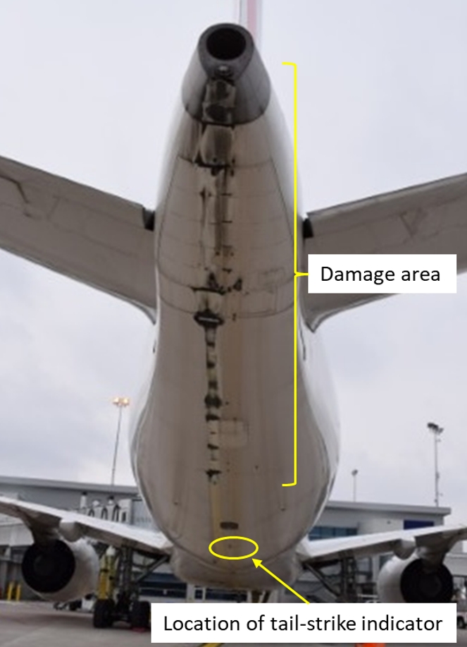The aircraft’s flight data recorder (FDR) and cockpit voice recorder (CVR) were successfully downloaded. Damage was identified in the fuselage and tail section, specifically aft of the tail-strike indicator between frames FR 92 and FR 102. The damage included skin delamination, punctures, damaged fasteners, an eroded flange, and a severely damaged tail cone with deformed skin and cracked frames.