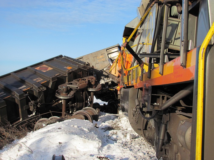 On 11 January 2013, at approximately 0018, Eastern Standard Time, freight train FCN 05 collided with the rear end of iron ore train BNL 005 at Mile 124.2 on the Quebec North Shore and Labrador Railway's Wacouna Subdivision, near Mai, Quebec. The first locomotive on train FCN 05 was completely destroyed and the second locomotive derailed. Eight cars on train BNL 005 derailed. The members of the FCN 05 train crew sustained minor injuries. Approximately 40 feet of track was damaged.